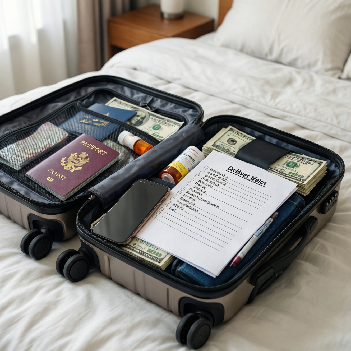 • Обязательно: паспорт/документы, деньги/карты, телефон, ключи, базовые лекарства.