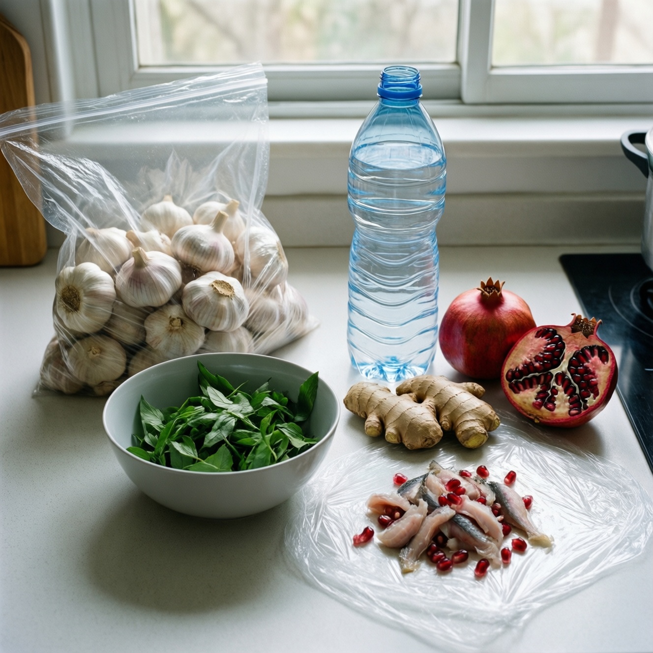 • Пакет-вкладыш в миске: все очистки (чеснок, имбирь, кожура граната) сразу уходят в пакет, затем пакет завязывается. Подходит, когда нужно быстро убрать рабочее место без лишних проходов к ведру.